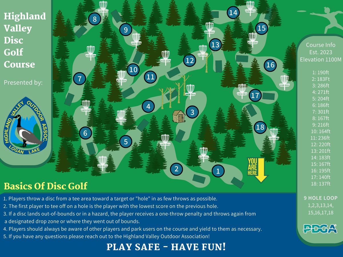 The Highland Valley Disc Golf Course was built in 2023 and is provided by the Highland Valley Outdoor Association. The primary volunteers for creating this course are Connie and Keith Scott, make sure to send a big thank you their way!