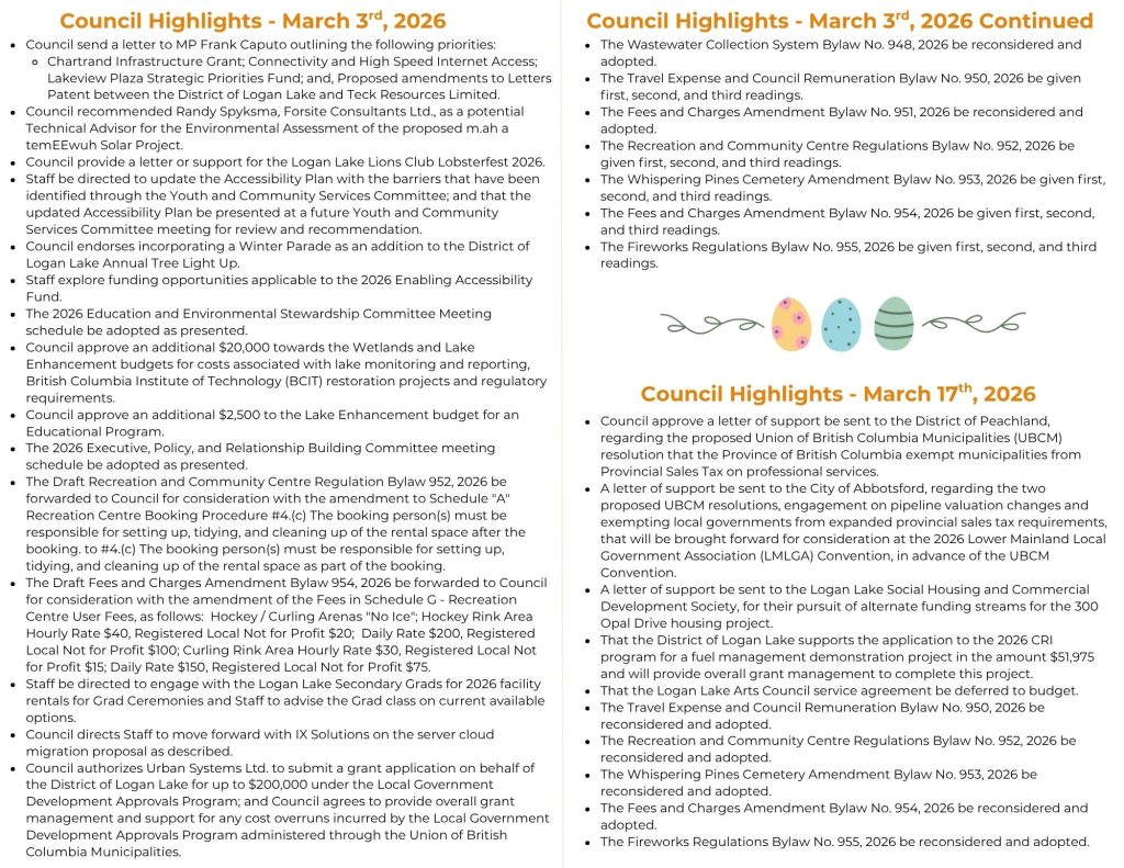 Phone: 250.523.6225 After-Hours Emergency: 250.523.6274 Fax: 250-523-6678 Email: info@loganlake.ca