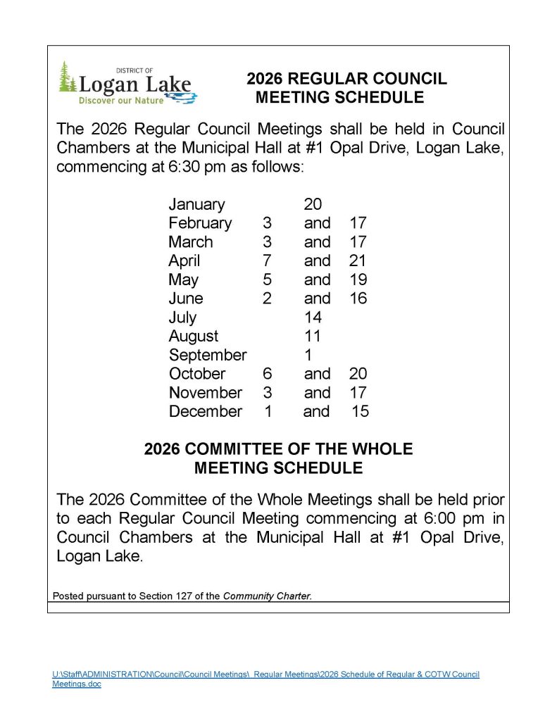 Agendas for Regular Council meetings are prepared and posted the Friday before the scheduled meeting and for Committee of the Whole, Special, or InCamera meetings, 24 hours prior to the meeting. The deadline for public submissions to a Regular Council Meeting agenda is the Thursday before the meeting. Please deliver submissions to the Municipal Office at #1 Opal Drive, or by mail to Box 190, Logan Lake, BC V0K 1W0, or by fax at 250.523.6678 or by email to info@loganlake.ca.